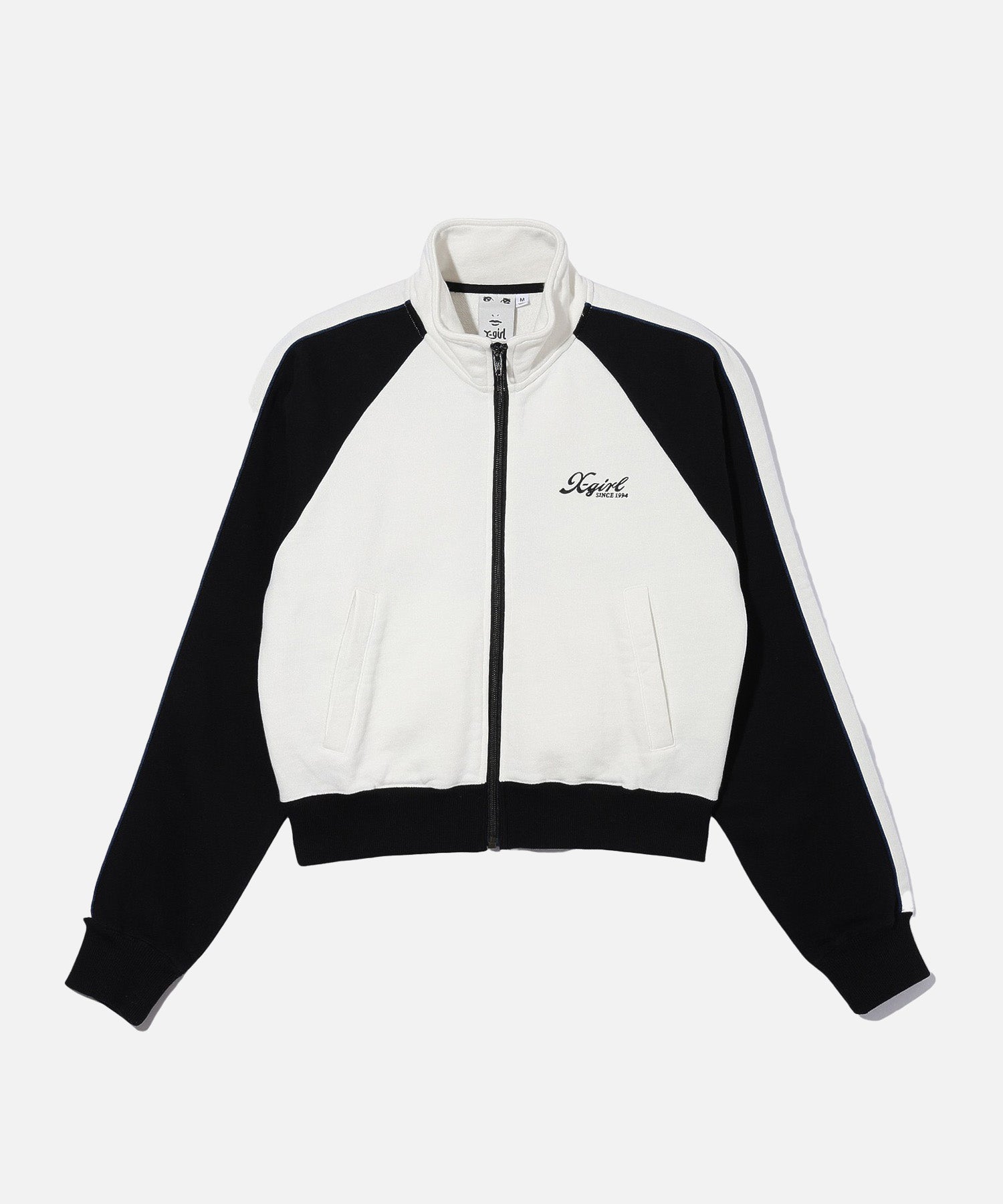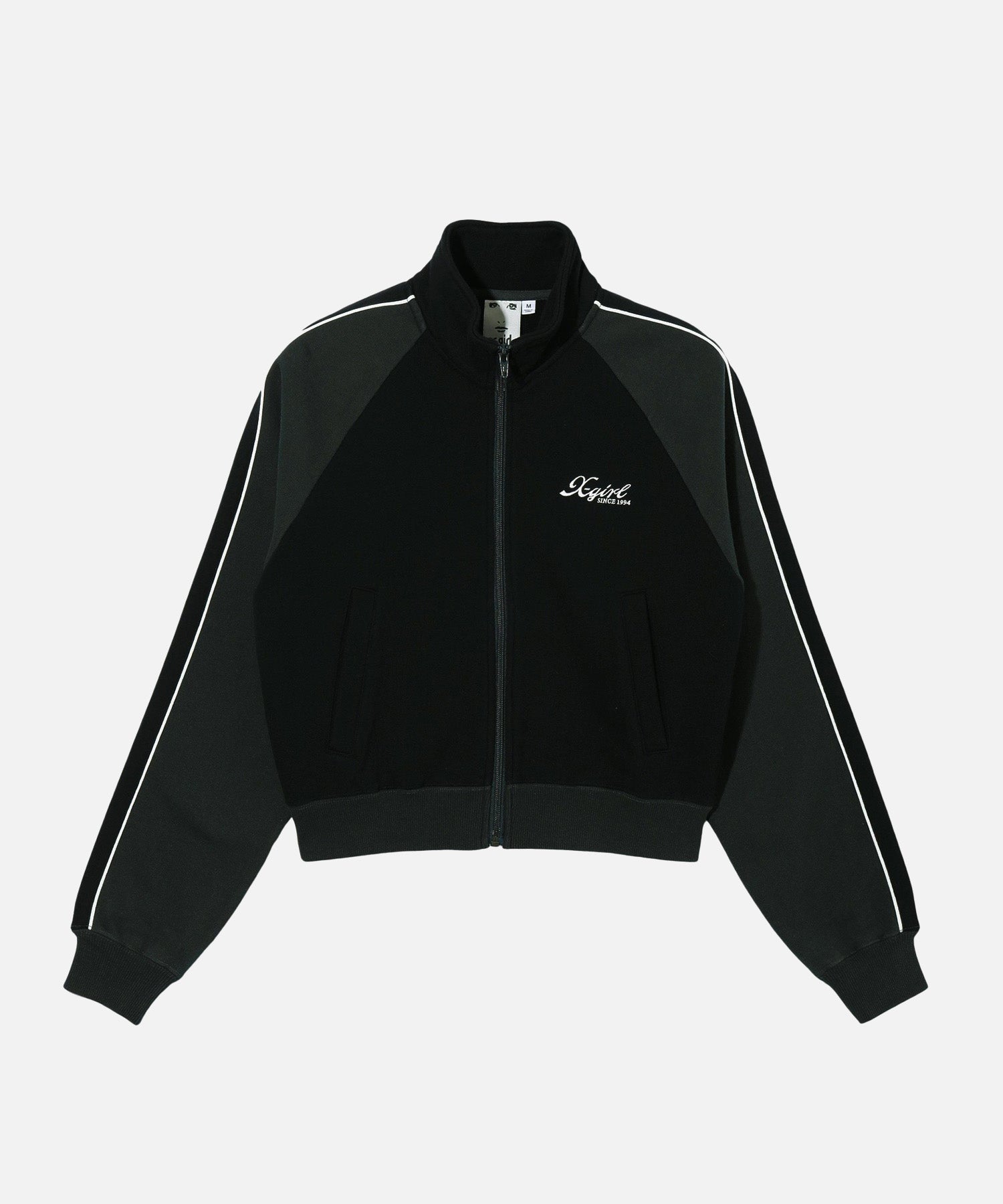 This full-zip fleece sweatshirt features a trendy compact silhouette, contrast-colored cord piping along the sleeve lines and an X-girl logo embroidery on the left chest.
